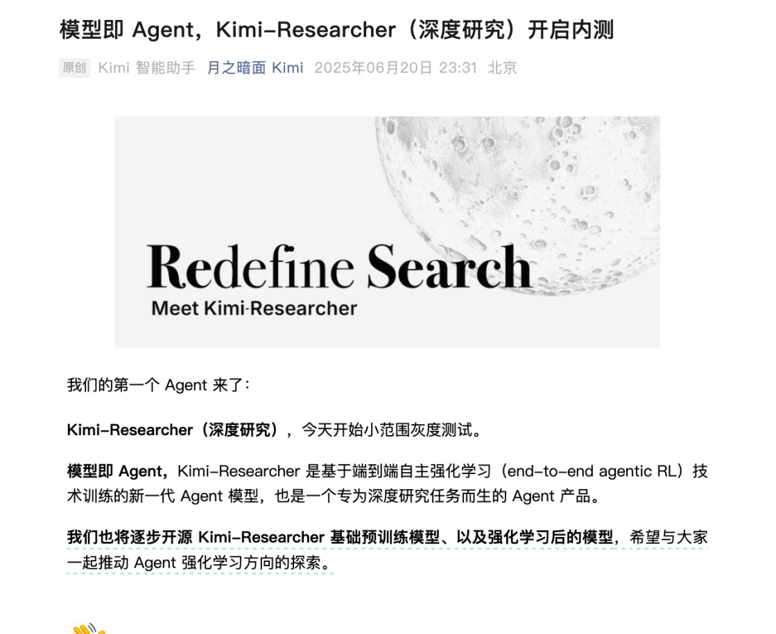 【环球网科技报道 记者 李文瑶】6月20日晚间,月之暗面Kimi对外宣布发布首个Agent产品Kimi-Researcher(深度研究),并开始小范围灰度测试。